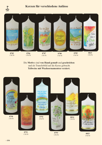Die Motive sind von Hand gemalt und geschrieben und als Transferbild auf die Kerze gebracht. Teilweise mit Wachsornamenten verziert.